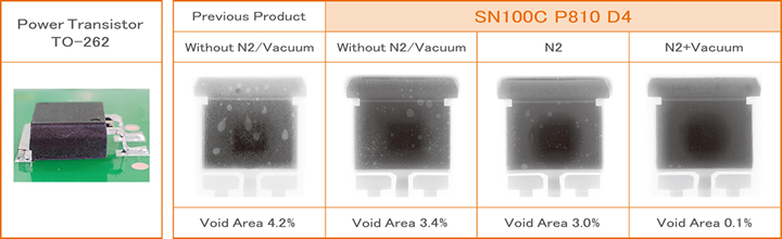 氣孔抑制的特殊化高可靠性焊錫膏 對應(yīng)大功率半導(dǎo)體組件等大面積焊接,氣孔的發(fā)生大幅減少,焊接可靠性提高。 真空回流爐的使用實現(xiàn)了低氣孔封裝。 |